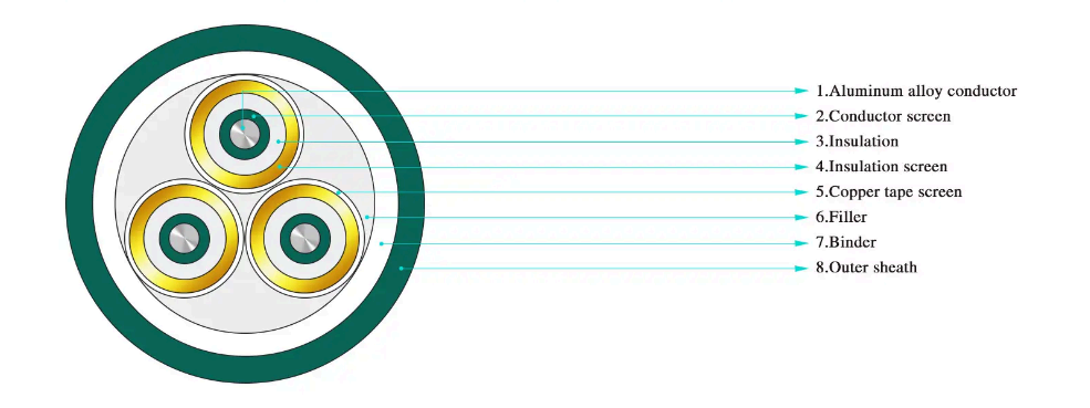 ·كابل طاقة عازل ثلاثي النواة من مادة XLPE لجهد مقنن من 3.6/6 كيلو فولت~26/35 كيلو فولت