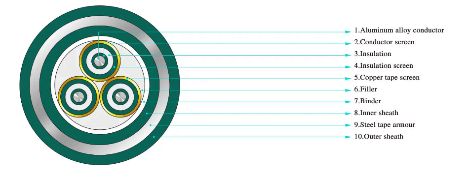 ·كابل طاقة مدرع من سلك فولاذي عازل XLPE ثلاثي النواة لجهد مقنن من 3.6/6 كيلو فولت ~ 26/35 كيلو فولت